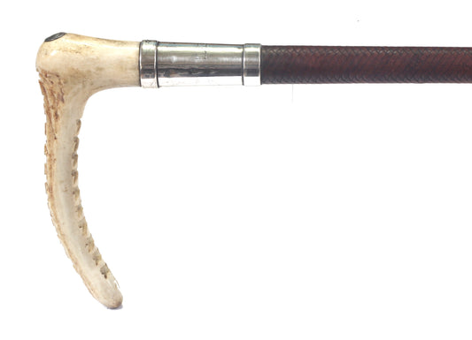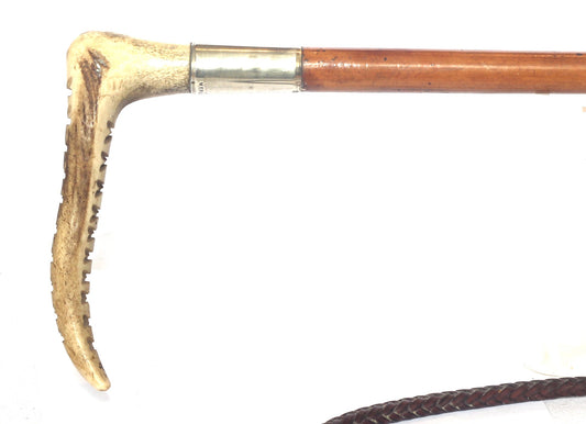 Antique Cane Hunting Whip with Braided Silver Collar - w1251