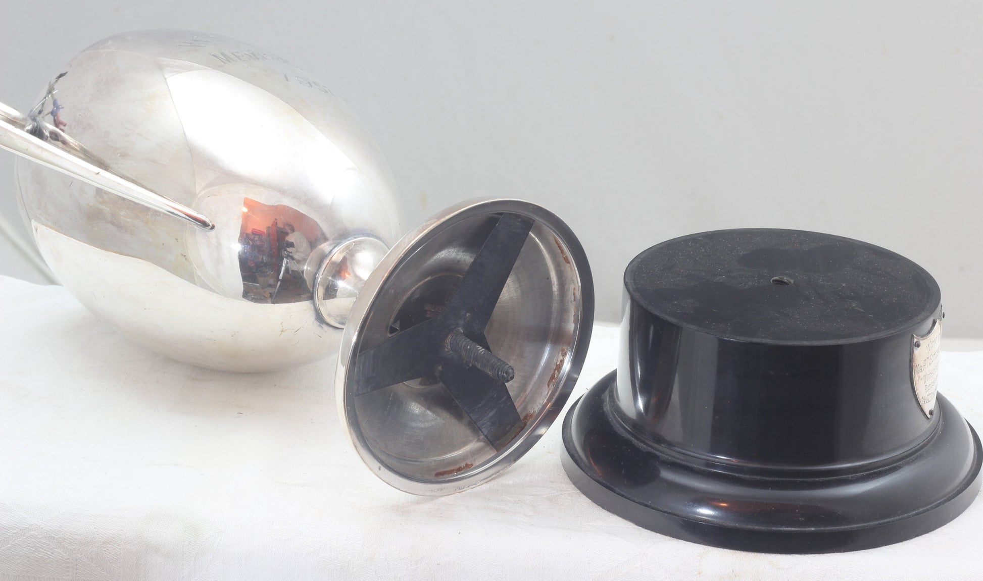 A pair of large silver plated cups or trophies on black plastic pedestals or bases