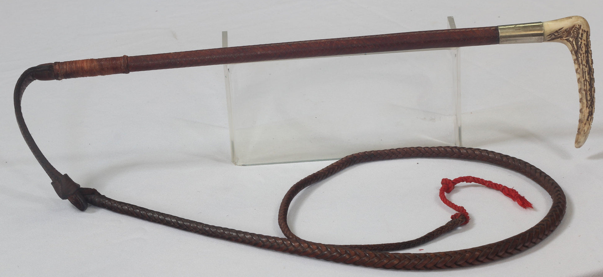 It has its original stitched leather keeper or tongue and a fine braided leather thong with a loop at the end and a red cord lash.
