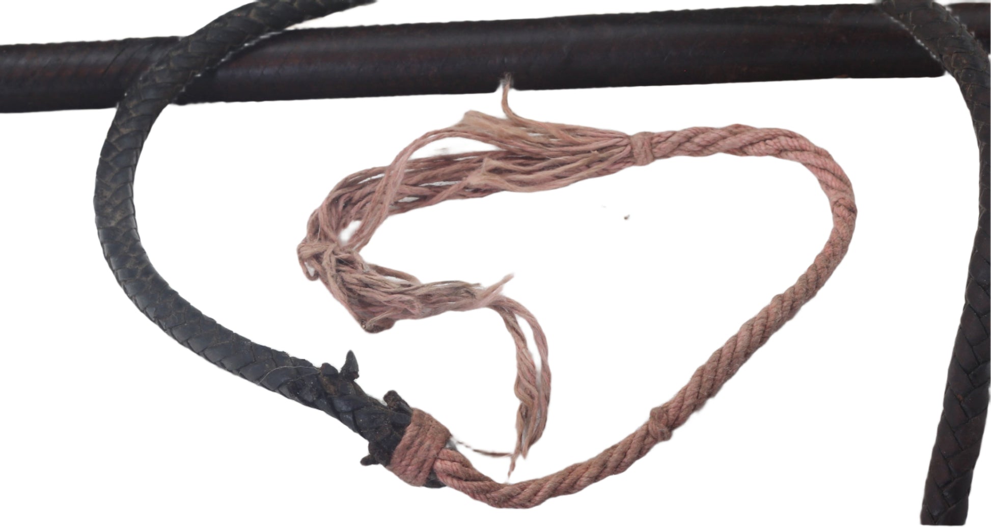 It has a braided leather thong with a red cord lash. There is fraying around the loop at the end of the thong.